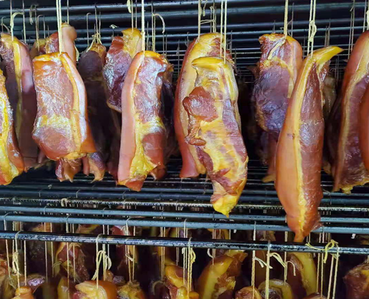 肉禽类产品代表物料有腊肉、腊肠、板鸭等,在常用生产中烘干量很大且物料容易腐败变质,因此控制要点是抑制细菌和平衡脱水。以腊肉为例,前期需快速升温,保证物料不会变质,但是烘干过程中温度又不能太高,否则油脂会快速溢出、产品也会熟化,并且在高温作用下物料表皮会结痂,影响内部水分析出,导致烘干品质下降,烘干难度提升,影响产品外观和品质。